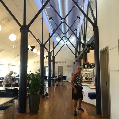 O primeiro, além de todas as atividades frequentes nesses espaços, oferece um serviço de aconselhamento para seus frequentadores, apoiando-os, por exemplo, nas decisões de venda das suas casas e compras de apartamentos menores, nas escolhas sobre onde aplicar melhor suas economias, etc. Localizado às margens de um dos lagos de Hørsholm, com invejáveis instalações físicas, é frequentado por mais de 700 idosos e gerido por uma equipe de três pessoas permanentes e grupos de voluntários. A “gerente” do Centro aparece, em uma das fotos abaixo, apoiada num rollator que a leva e traz para o trabalho diário.